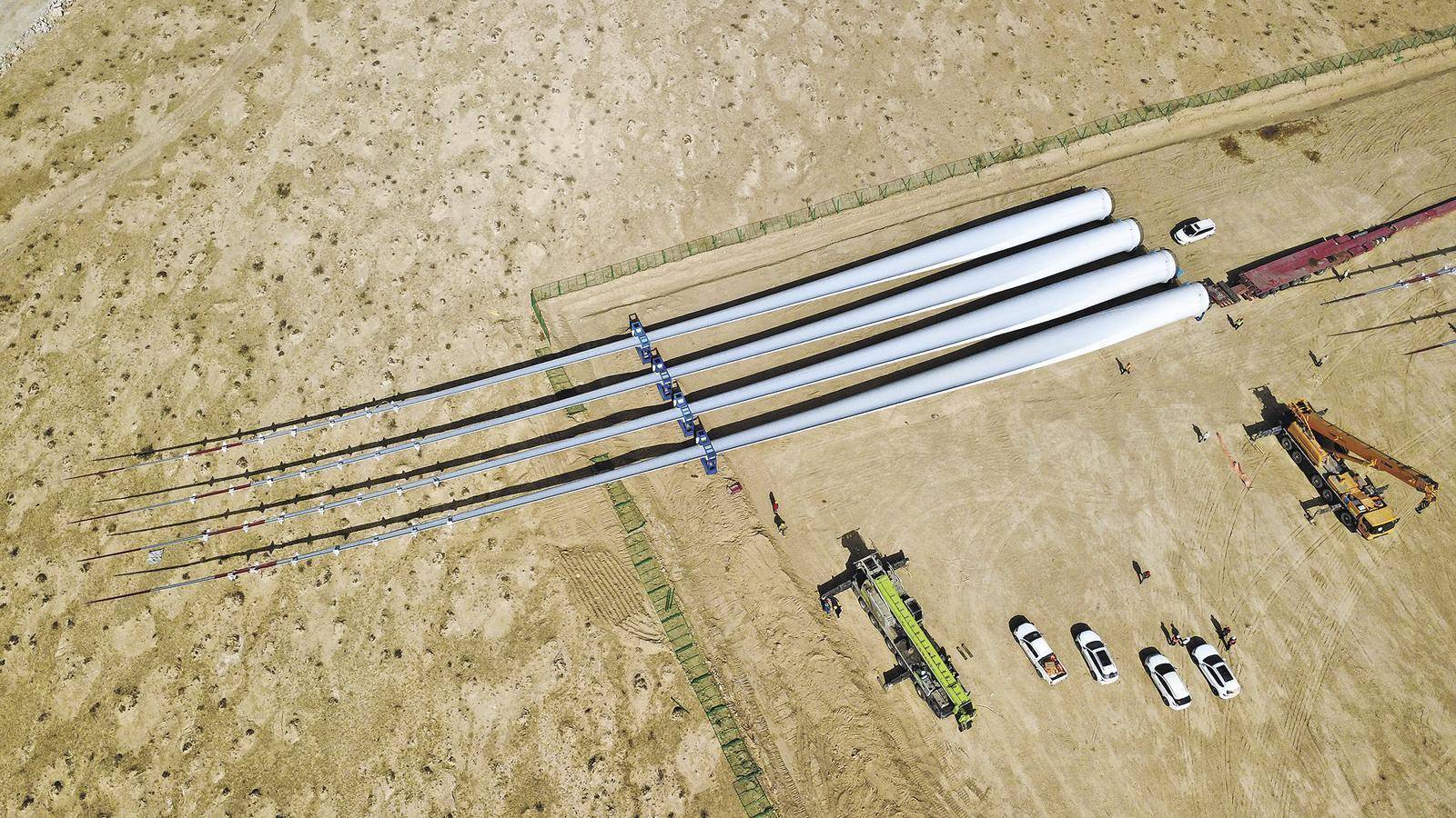 r在海西蒙古族藏族自治州都兰县旺尕秀区域的项目现场,大件运输紧锣密鼓。目前,已有叶片3套、机舱2台、轮毂2台、传动链5台顺利运抵现场。项目整体计划于2026年内建成投运,将为青海省打造国家清洁能源产业高地、实现“十五五”高质量开局提供坚强的绿色支撑。图为大唐海西州55万千瓦风电项目第一批叶片陆续在堆场卸车。